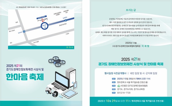 제21회 경기도장애인정보화제전 시상식 및 한마음축제 개최 작성자 정보 경기도협회 작성 작성일 2025.10.15 11:12 컨텐츠 정보 17 조회 목록 본문 - 제21회 경기도장애인정보화제전 시상식 및 한마음축제 개최 안내 - 행사일정 : 식전공개행사, 내빈 입장 및 시군지회 입장 일시 : 2025년 10월 29일 수요일 11시 장소 : 렛츠런파크 서울 럭키빌 6층 컨벤션홀 주최 : 경기도장애인정보화협회 관련자료 다음 제21회 경기도 장애인 정보화제전 심사 결과 안내 작성일 2025.09.04 13:30 댓글 0 등록된 댓글이 없습니다. 로그인한 회원만 댓글 등록이 가능합니다. 목록